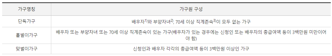 - 18세 미만 부양 자녀 : 입양자를 포함하며 부모가 없거나 부모가 자녀를 부양할 수 없는 일정한 경우 손자녀, 형제자매를 부양 자녀 범위에 포함하며 부양 자녀의 연간 소득 금액 합계액이 100만 원 이하여야 함