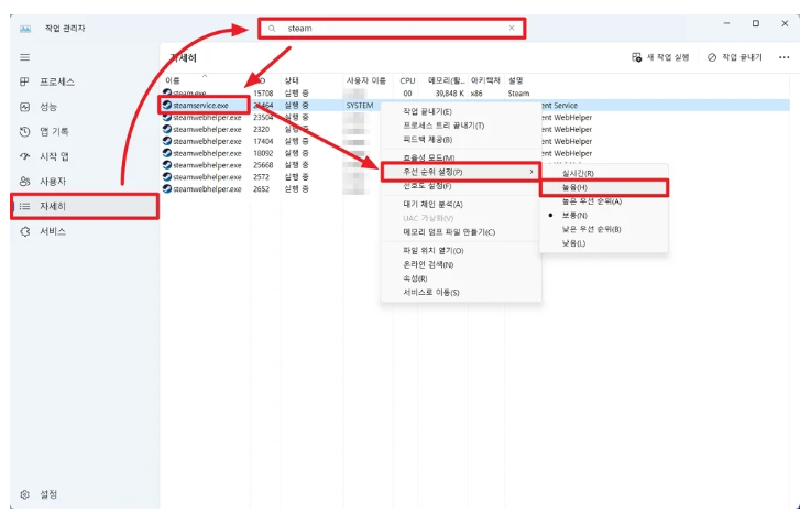 스팀이 실행되고 있는 상태에서 작업 관리자 실행 후 좌측 메뉴에서 자세히를 클릭합니다. 클릭한 뒤 상단 검색창에 steam을 입력하고 steam service 항목을 찾아 마우스 우클릭 후 우선 순위 설정 > 높음으로 선택을 하게 되면 가용할 수 있는 PC의 지원을 steam에 먼저 할당할 수 있습니다.
