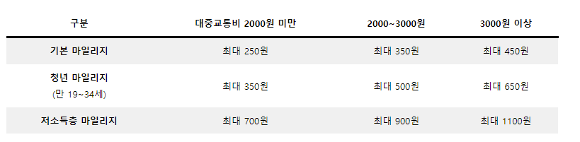 마일리지 적립 금액은 대상에 따라 3가지로 나뉩니다. 기본, 청년, 저소득층 마일리지가 있으며, 적립 금액은 하단과 같습니다.