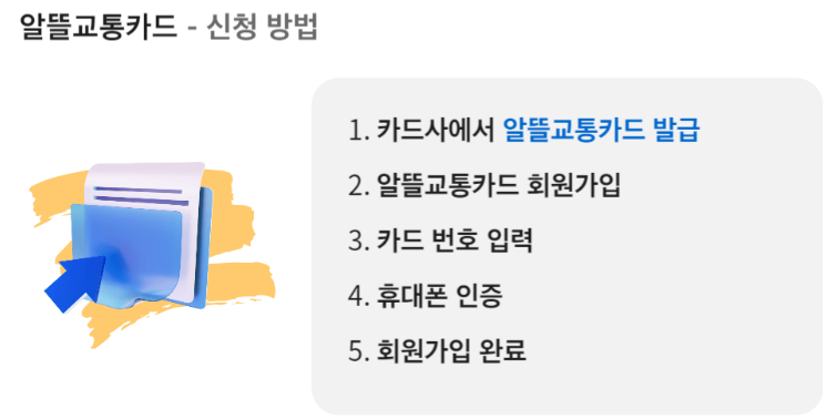 아래와 같이 카드사에서 알뜰교통카드를 먼저 발급받으신 후, 알뜰교통카드 회원가입이 가능합니다. 어떤 카드사를 선택해야 할지 고민인 분들은 맨 아래의 함께 보면 좋은 글에서 체크카드 및 신용카드 비교 글에서 확인하시길 바랍니다.