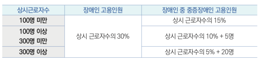 · 장애인 및 중증장애인을 상시근로자 수 대비 일정 비율 이상 고용