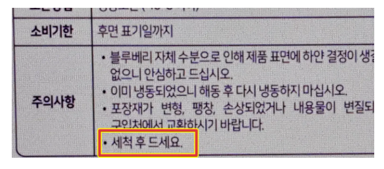 하지만 하단 사진과 같이 농산물이라고 기재 되어 있거나 세척 후 섭취하라는 문구가 표시되어 있다면 세척하지 않은 제품이므로 반드시 세척 후 섭취하시는 것이 좋습니다. 블루베리는 물에 담궈 세척하면 안토시아닌이 다 빠져나가기 때문에 30초간 흐르는 물에 가볍게 세척한 뒤 섭취하시는게 좋습니다.