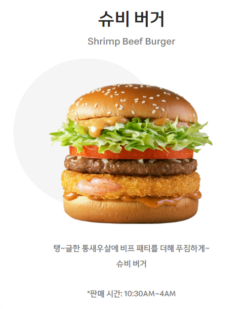 탱글한 통새우살 패티와 순쇠고기 패티, 토마토, 양상추 등 다양한 재료가 풍성하게 들어가 있으며 탱글한 식감의 통새우살을 즐김과 동시에 육즙 가득한 소고기 패티의 맛이 어우러져 해산물과 고기를 좋아하시는 분들이라면 누구나 맛있게 즐기실 수 있습니다.