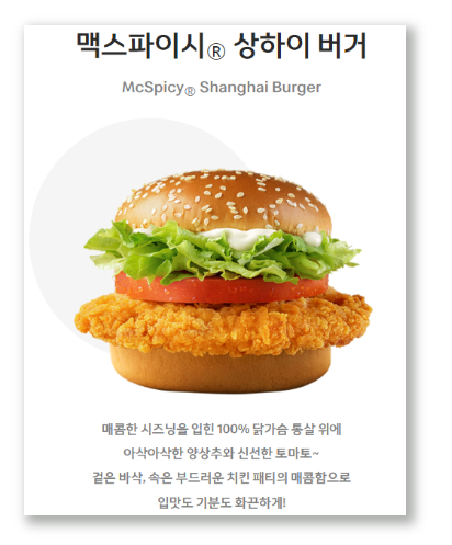 맥도날드의 근본적인 메뉴입니다. 그냥 치킨이 아닌 크리스피한 치킨 패티에 매콤한 맥스파이시 소스를 바르고, 부드러운 닭가슴 통살을 사용하며 신선한 야채 위에 뿌려진 마요소스가 환상적인 맛입니다.
