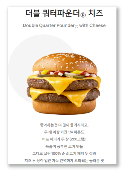 쿼터파운드 치즈버거는 패티가 정말 두꺼운 것이 특징입니다. 두꺼운 패티가 무려 두장이나 들어가 있는데요, 다른 햄버거 패티의 두 배 이상의 크기이며 패티 본연의 맛과 치즈 맛 또한 제대로 느껴지기 때문에 수제 햄버거 느낌을 좋아하시는 분들께 추천드리는 버거입니다. 혹여 큰 패티가 부담스러우시다면 일반 쿼터파운드 치즈버거도 있으니 참고하시길 바랍니다.