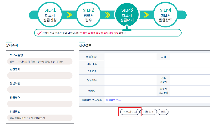 6) 화보서 인쇄를 클릭하면 범죄경력회보서가 발급 완료됩니다.