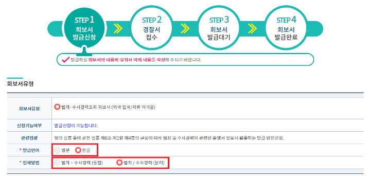 3) 주의사항을 확인 한 후, 발급언어와 인쇄방법을 선택합니다. 참고로, 범죄 • 수사 경력을 통합하거나 분리하여 인쇄가 가능합니다.