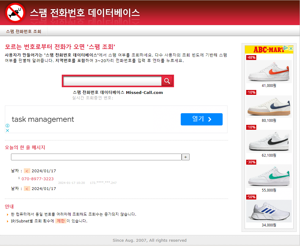 하단의 바로가기를 클릭하시면 데이터베이스 페이지로 이동합니다. 데이터베이스는 데이터베이스를 이용하는 사용자들이 만들어 가는 웹사이트이며, 다수 사용자의 조회 빈도에 기반해 스팸 여부를 판별 해 줍니다.