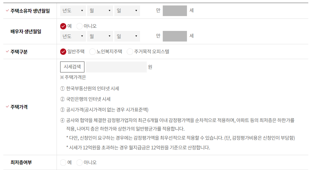 먼저, 주택 소유자의 생년월일을 입력하신 뒤 주택 대상을 선택합니다. 이후, 주택 가격의 경우는 시세 검색을 통해 정확한 값을 기재하셔도 되고, 시세를 알고 계신다면 직접 입력하셔도 됩니다.