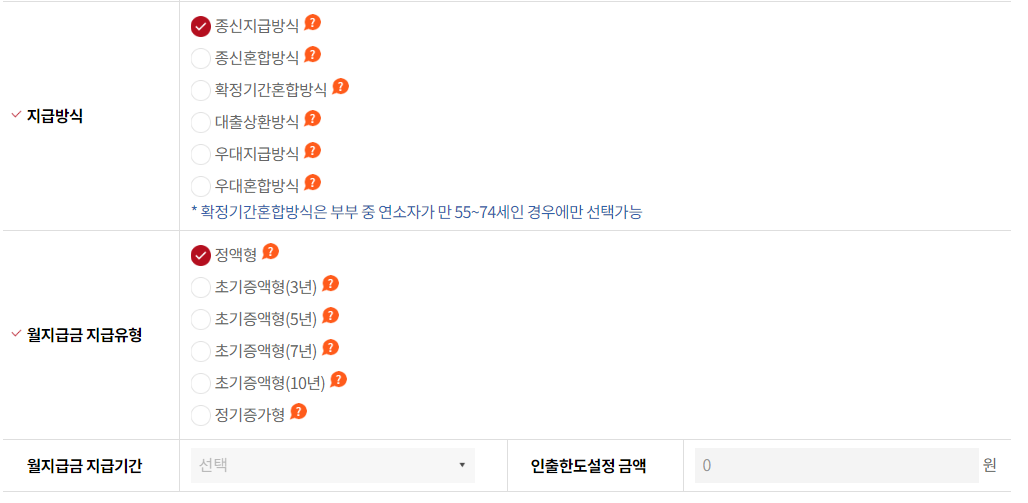 그리고 지급 방식을 설정하는데, 보통 종신 지급 방식을 선호하고 있으며 월 지급금 지급유형도 정액형으로 일정한 금액을 받는 것이 좋습니다.