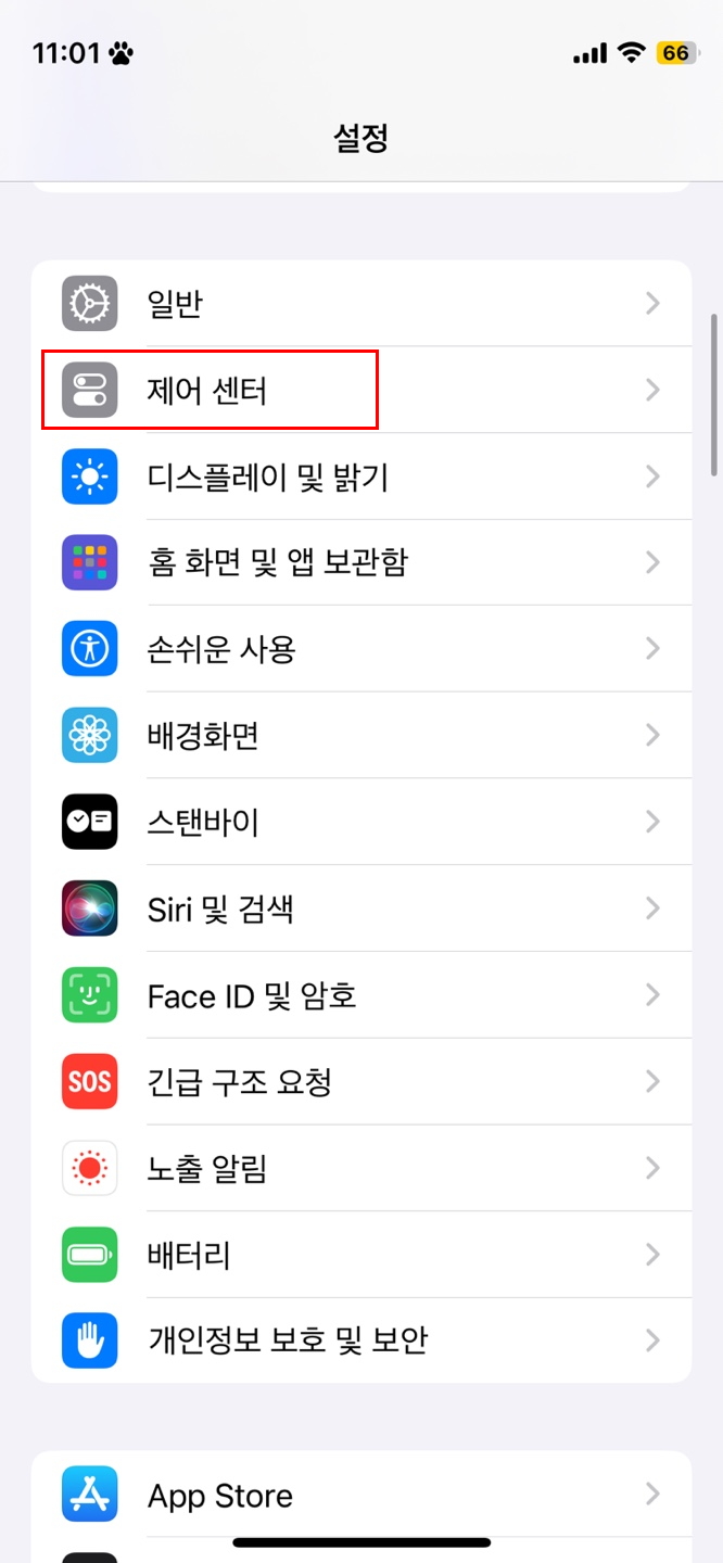 1) 설정앱에 접속 후 제어센터를 클릭합니다.